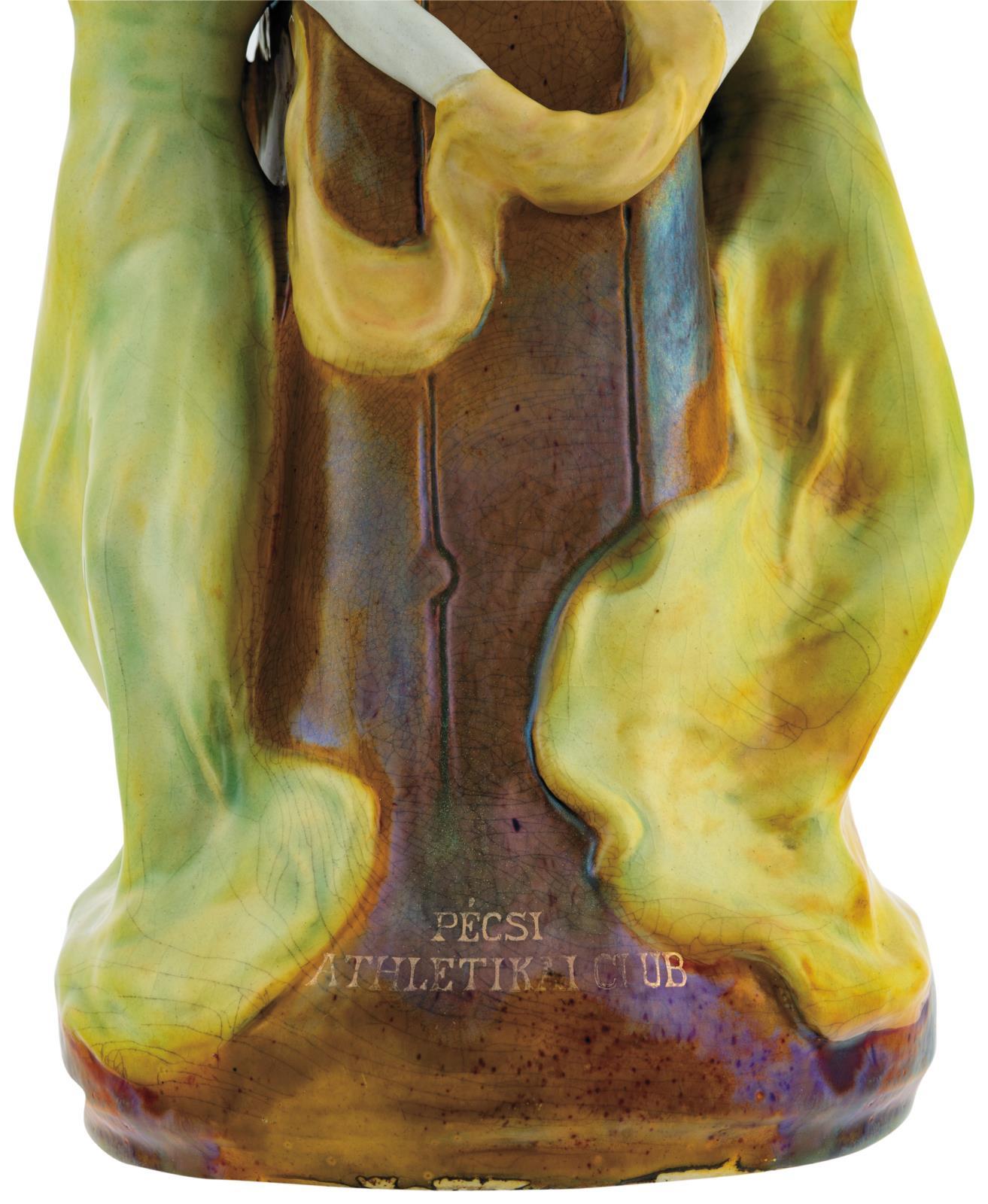 Jelzés: domború körpecsét, masszába nyomott 6101, 1, 36; a tárgy oldalán Mack Lajos masszába nyomott jelzése, egy makk és L betű, szintén a tárgy oldalán arannyal írt kézírás: PÉCSI ATHLETIKAI CLUB