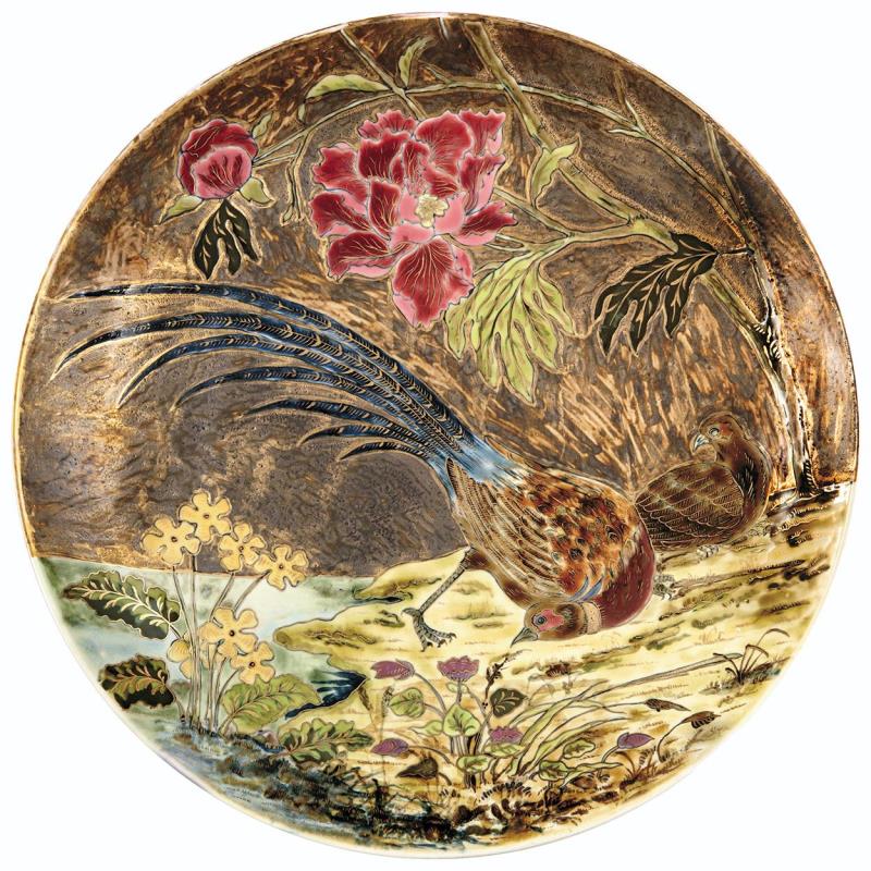 Falitál, peóniaágak alatt csipegető fácánpár képével, 1882 körül, DEKORTERV: ZSOLNAY, JÚLIA