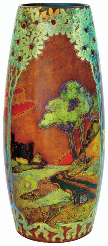 Váza, a felkelő nap, vitorlás és oszlopcsarnok körképével, Zsolnay, 1899