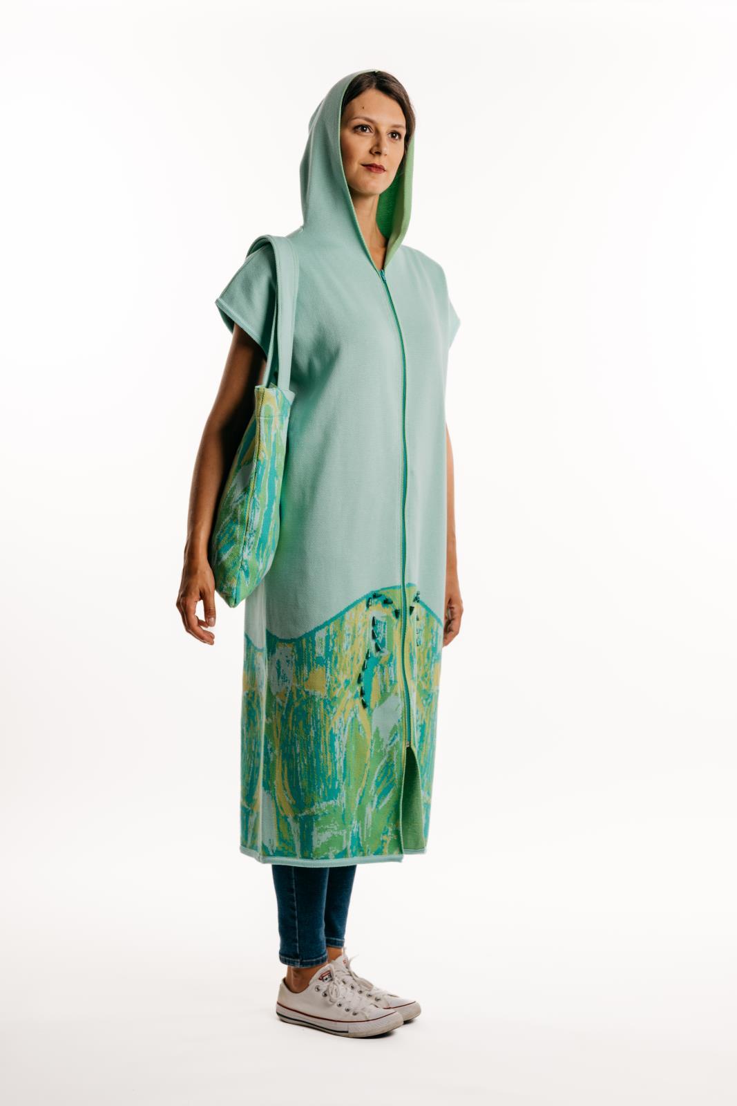 Egyedi tervezésű maxi, cipzáras, kapucnis mellény- kardigán, kötött shoppingbagben