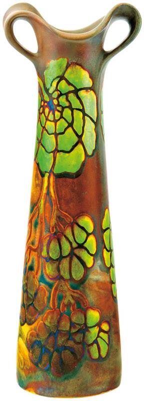 Karcsú váza, két füllel, fürtös virágos díszítéssel, 1901, FORMATERV: SIKORSKI TÁDÉ, DEKORTERV: APÁTI ABT SÁNDOR