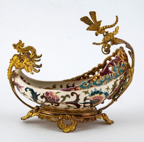 Kínáló, szitakötős-sárkányos fémszerelékkel, Zsolnay, 1885 körül