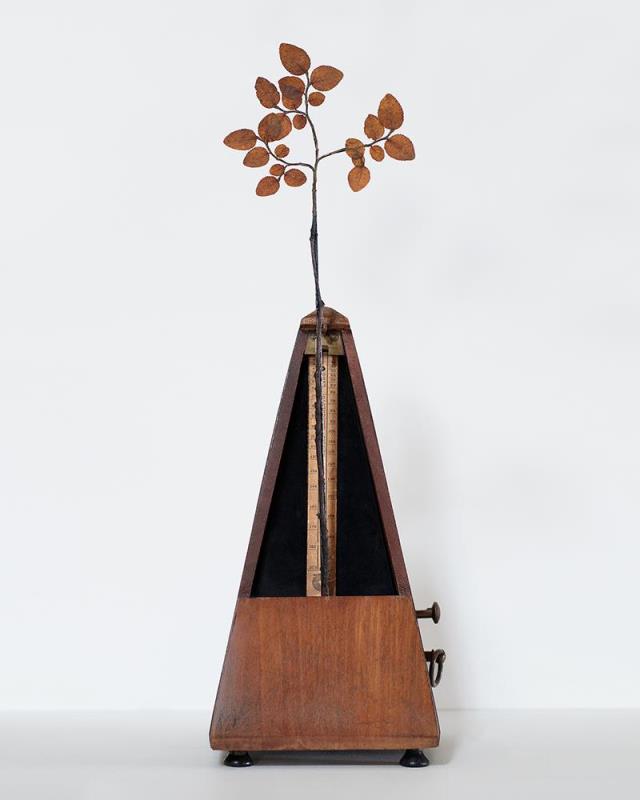 az állhatatosság kertje című kinetikus installáció egyik darabja: 19. századi herbáriumból származó rózsaág egy antik, rózsafábólkészült metronóm ingáján