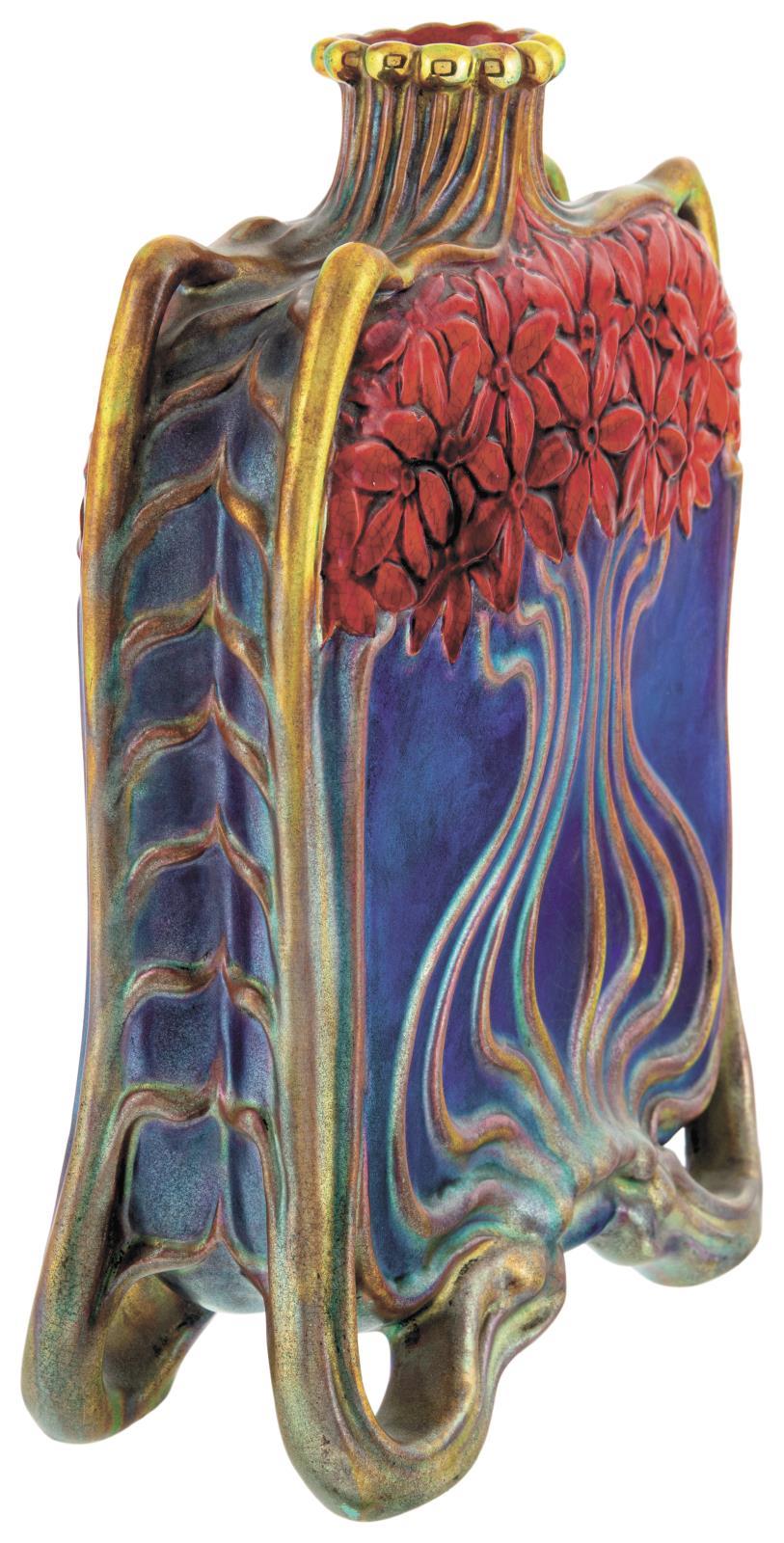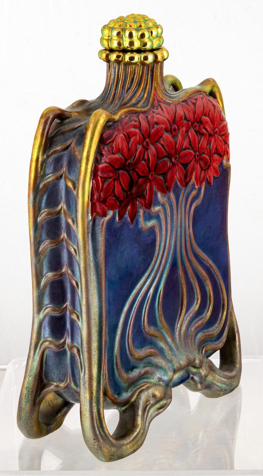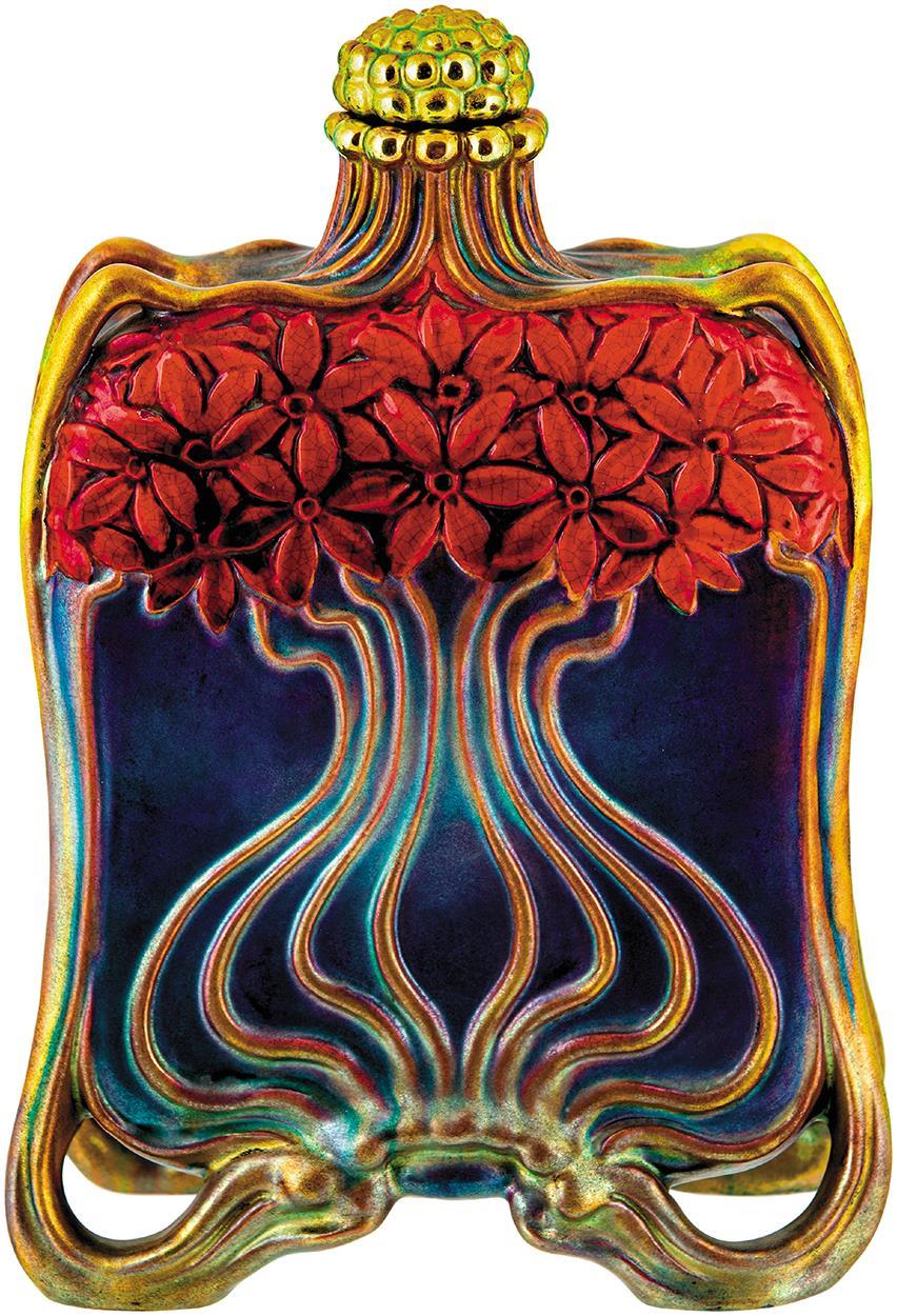 Kulacs szecessziós növényi díszítménnyel, Zsolnay, 1900; Formaterv feltehetően: Mack Lajos