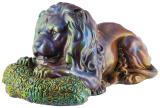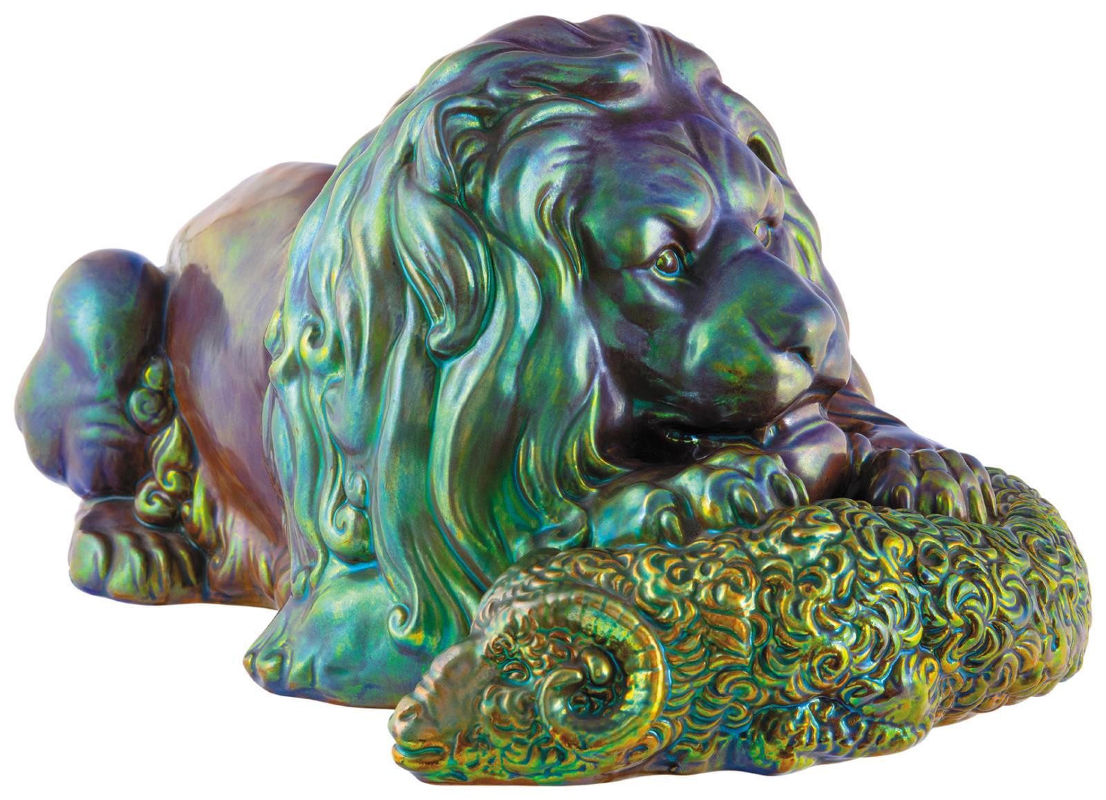 Szobor, oroszlán prédájával, Zsolnay, 1910 körül; Formaterv: Mattyasovszky Zsolnay László