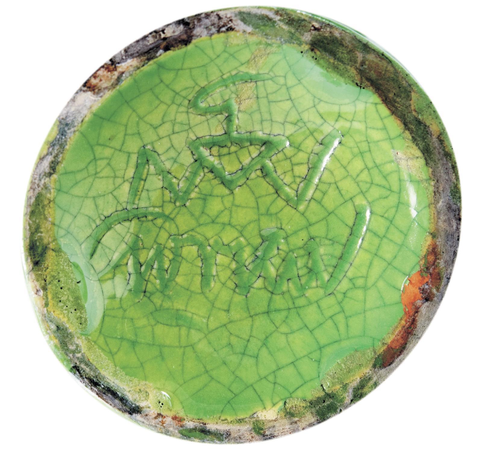 Vörös cserép, korongolt forma. Sárga és almazöld, repesztett mázakkal festve.