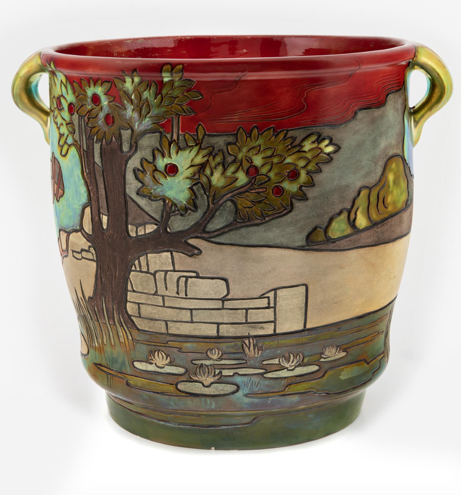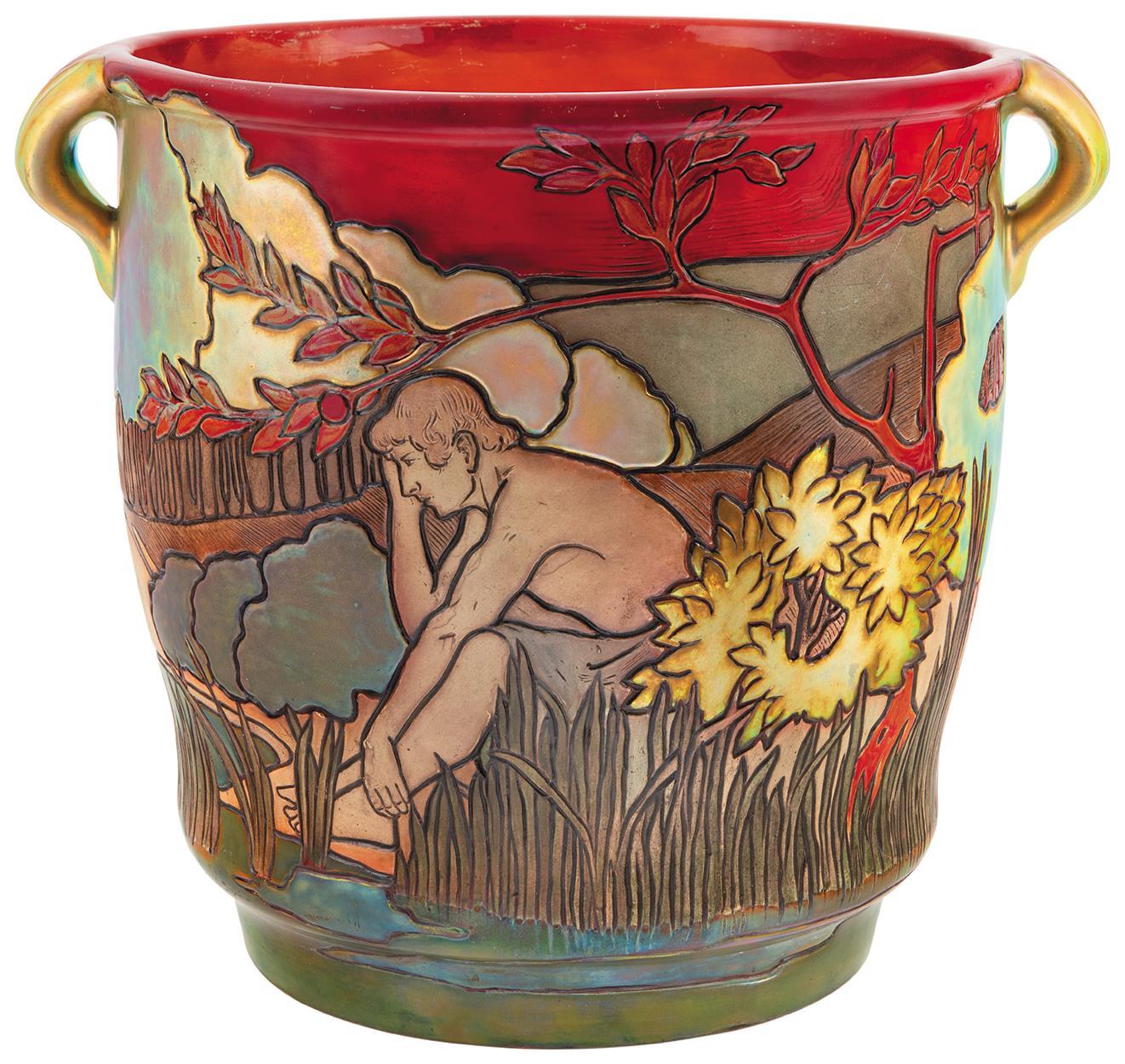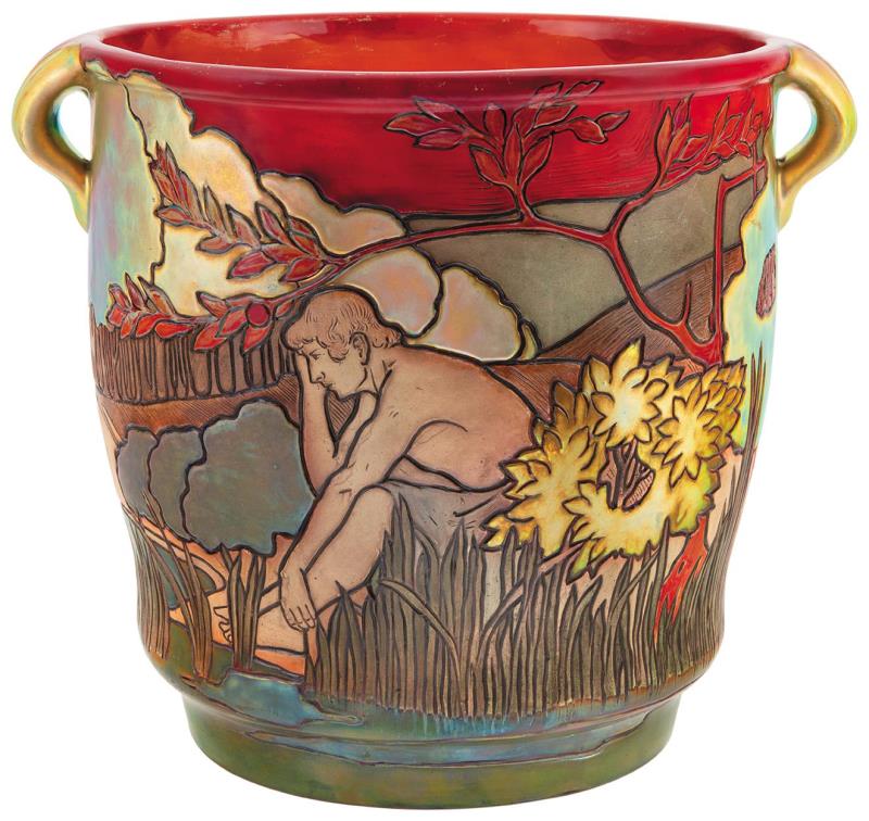 Virágedény, gondolkodó férfialakkal és virágzó fa körképével, Zsolnay, 1904; Terv: Apáti Abt Sándor, Éve: 1904, Formarajzi bejegyzés: Abt Sándor mintája