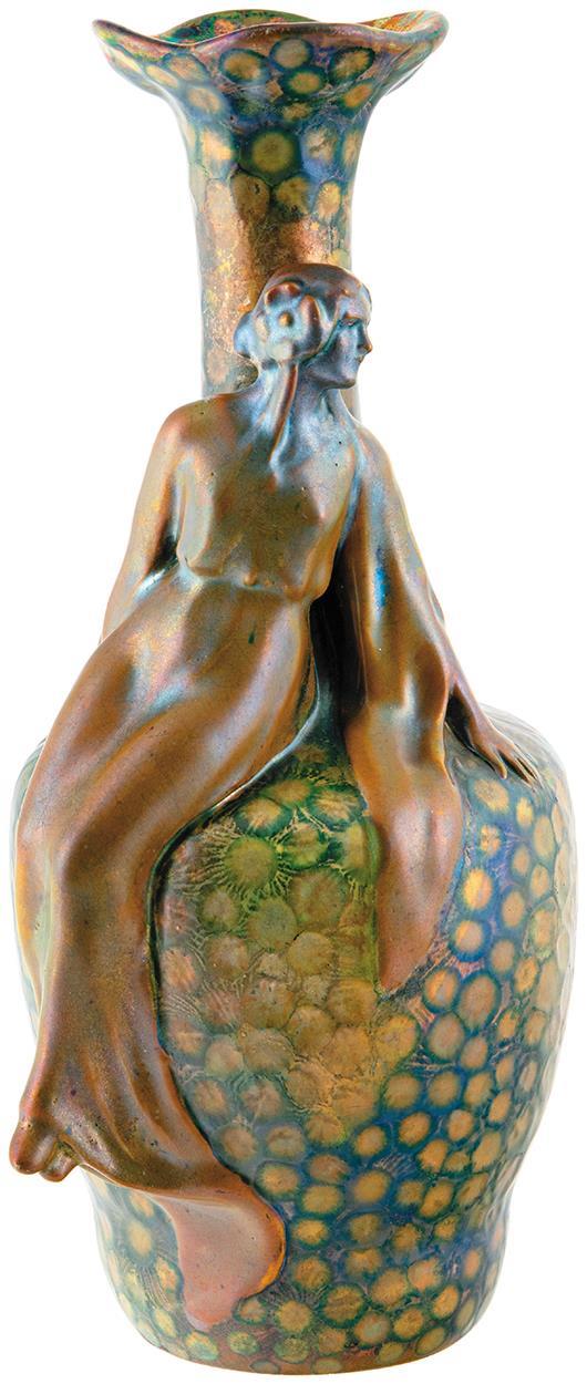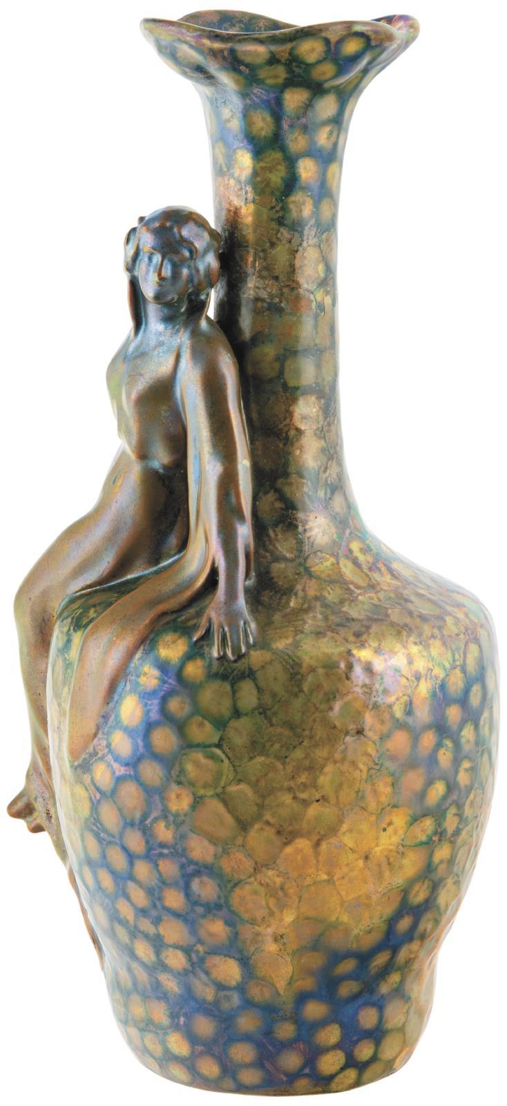 Váza, nőalakos kisplasztikával, Zsolnay, 1902 körül; Formaterv: Mack Lajos
