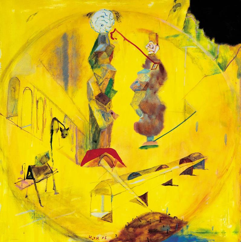 Jelezve középen lent: UJH 06, Jelezve hátoldalon: Ujházi Péter 2006 "Porond" 100 x 100 olaj, vászon