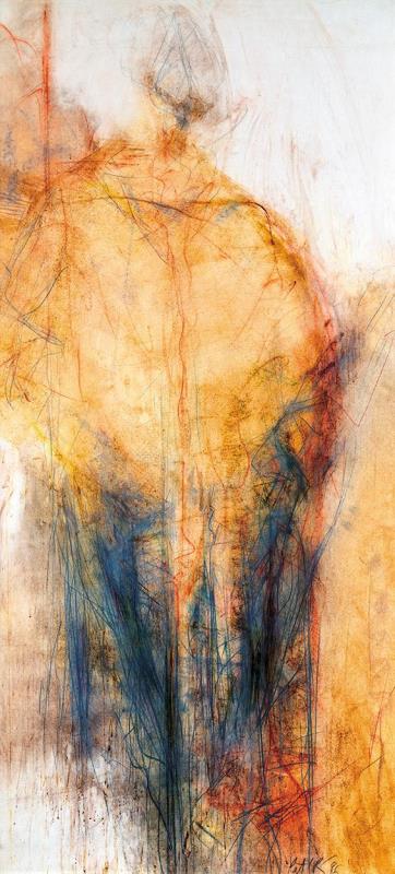 Jelezve jobbra lent: Pet'R '96, Jelezve hátoldalon: Kovács Péter pecsét, "Lény" (Hát) 150x70 cm papír, farostlemez, v.t.