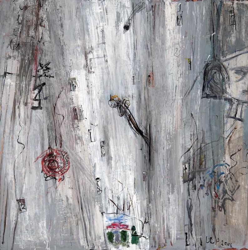 Jelezve jobbra lent: UP 2004; Jelezve hátoldalon: Ujházi Péter "Liftek" 2004 farost, akril 100x100
