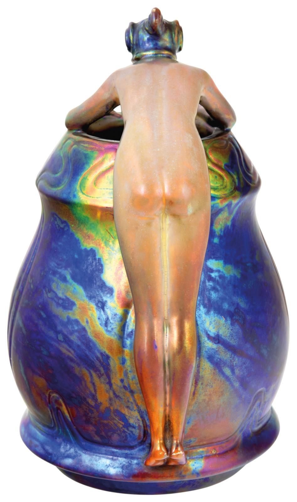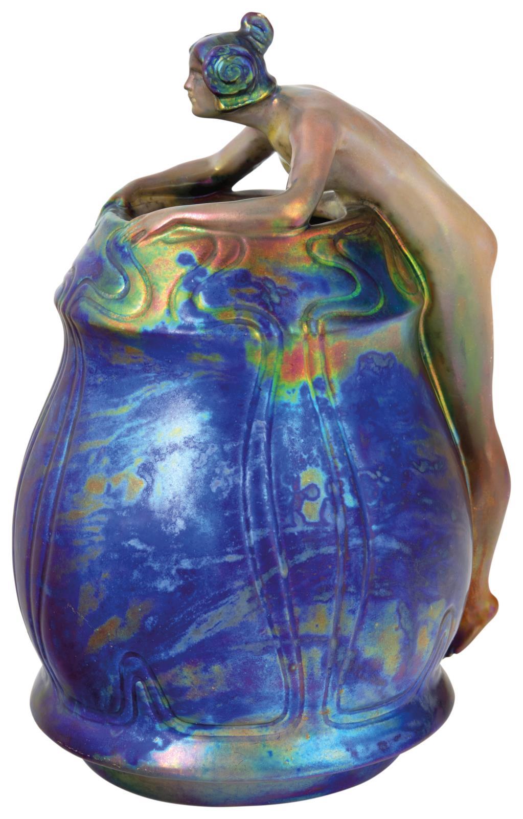 Váza, ráhajló női figura-dísszel, Zsolnay, 1902 körül, Formaterv: Mack Lajos