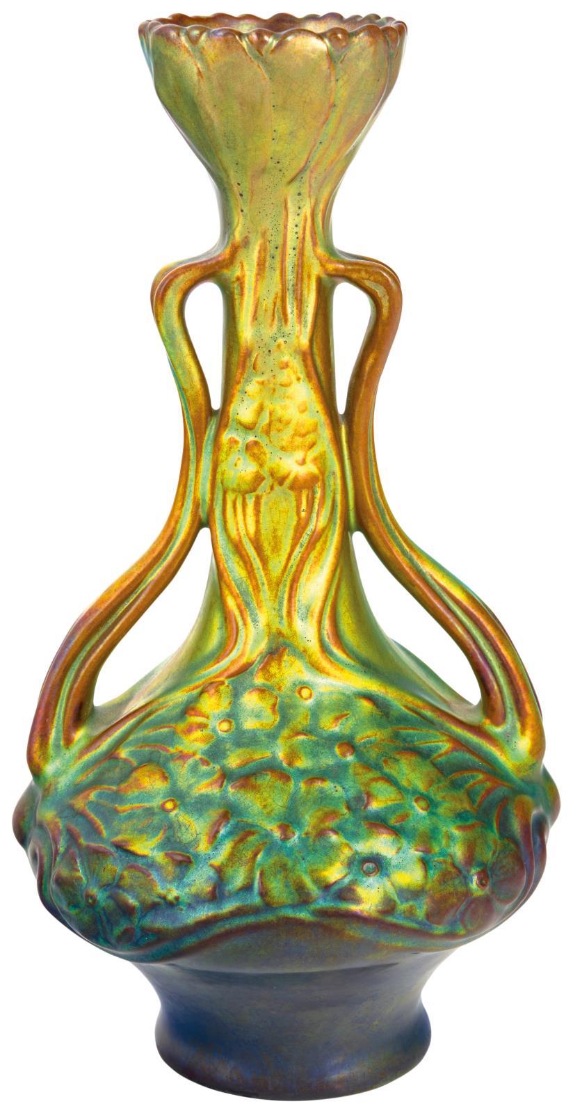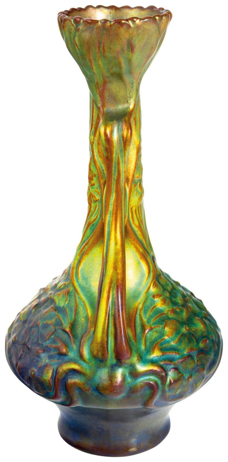 Floreális díszítményű váza, inda formájú fogókkal, Zsolnay, 1900 körül