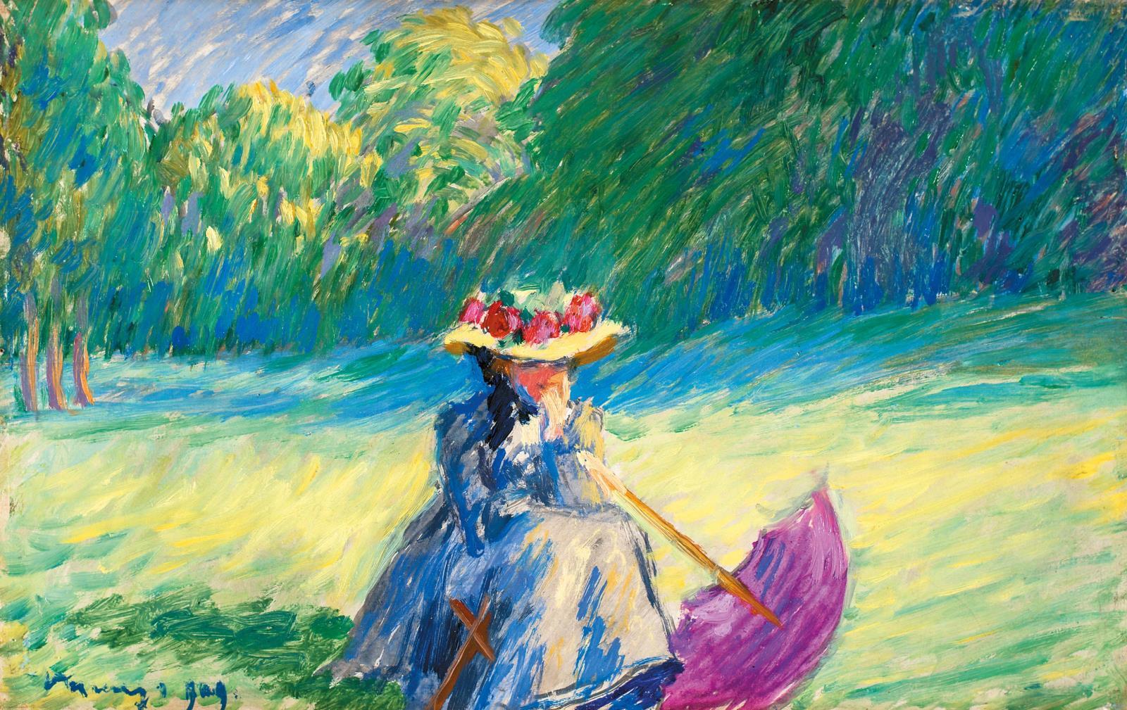 Ülő nő lila napernyővel, 1909