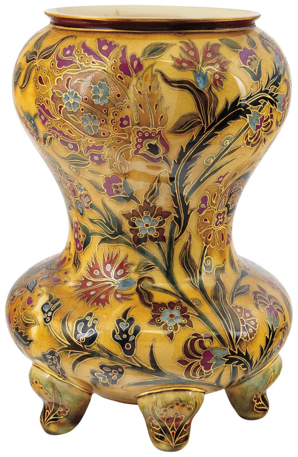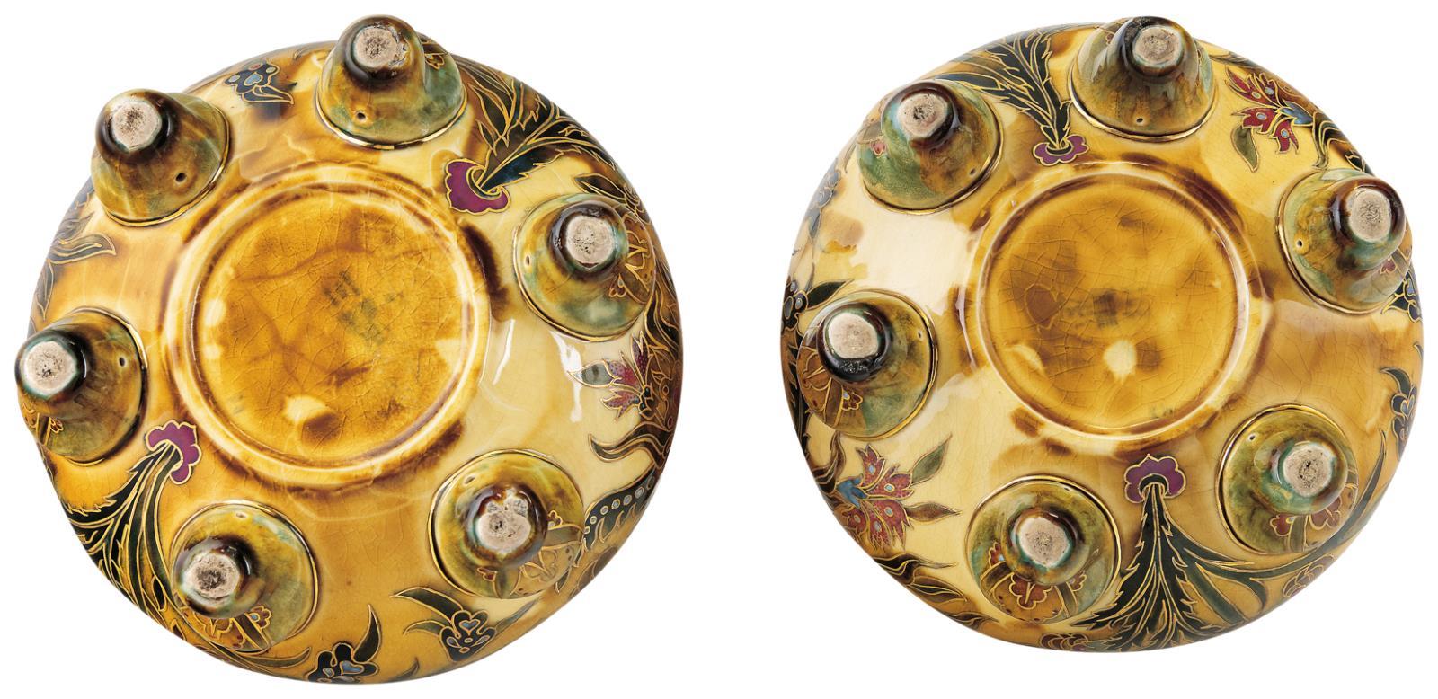 Porcelánfajansz, korongozott részekből összeállítva. Kétrétegű alapmáz felett erős tüzű színes zománcokkal festett, arany kontúrvonalak között. FORMA-ANALÓGIA: - Csenkey Éva, Hárs Éva, Weiler Árpád: Zsolnay. A gyűjtők könyve, Corvina Kiadó, 2003; 91. ábra - Federico Santi, John Gacher: Zsolnay Ceramics. Collecting a Culture, Schiffer Publishing Ltd, 1998; 67. oldal