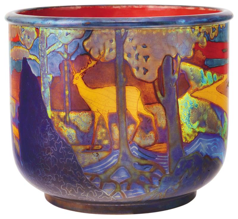 Virágtartó edény, tájban álló őz és erdő díszítményével, 1908