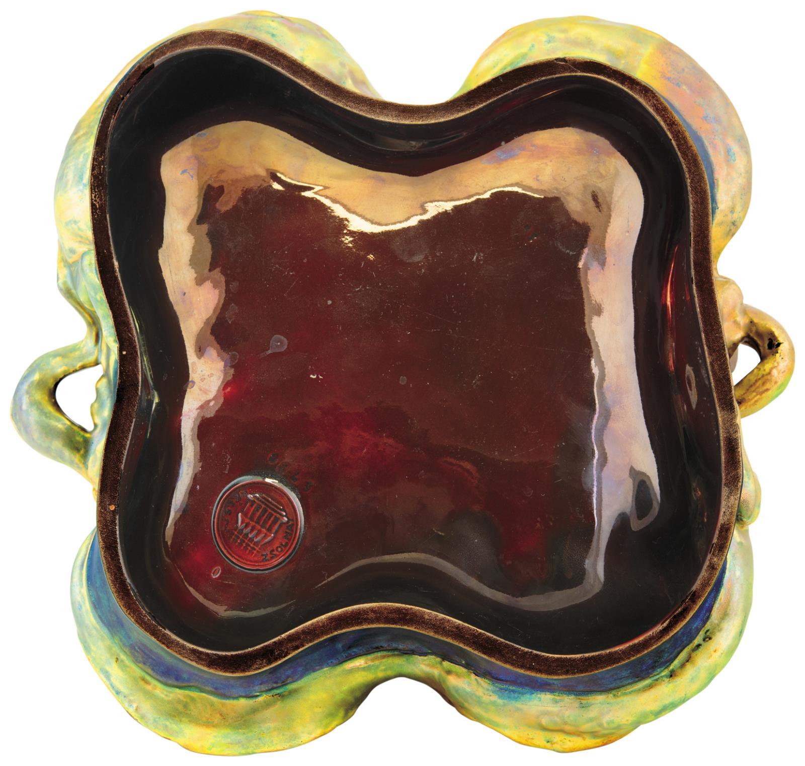 Keménycserép, ráilleszett plasztikus részekkel. Színes, opak és transzparens eozinmázakkal festett. Savmaratott, a szemek fényesen hagyottak FORMA-ANALÓGIA: - Csenkey Éva: Zsolnay szecessziós kerámiák, Helikon Kiadó, 1992; 74. ábra - Csiba Mónika, Stattner Richárd: Zsolnay – A magyar szecesszió mesterművei, Elite Design Kft., 2003; 70. ábra