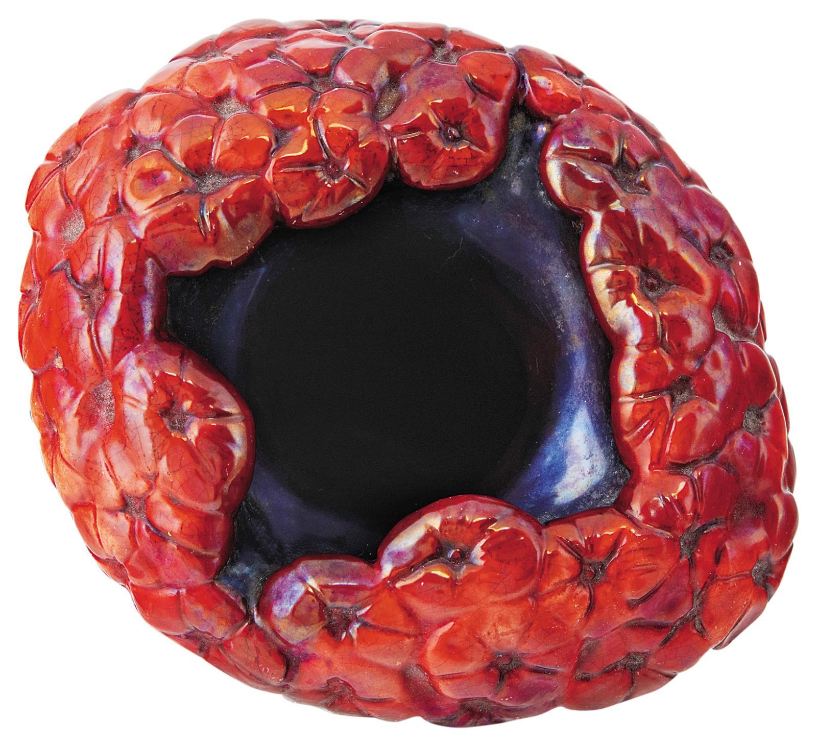 Keménycserép, formába préselve. Opak és transzparens eozinmázas festés, savmaratástól irizáló felület.