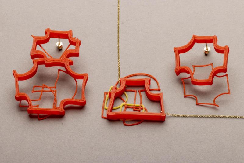 1, 3d nyomtatott piros bedugós fülbevaló 14 karátos arany stifttel 2, 3d nyomtatott sárga és piros fülbevaló 14 karátos arany alkatrészekkel 3, 3d nyomtatott piros és sárga aranyozott ezüst nyaklánc