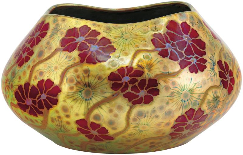 Virágtartó edény, a testet sűrűn betakaró virágdíszítéssel, Zsolnay, 1904