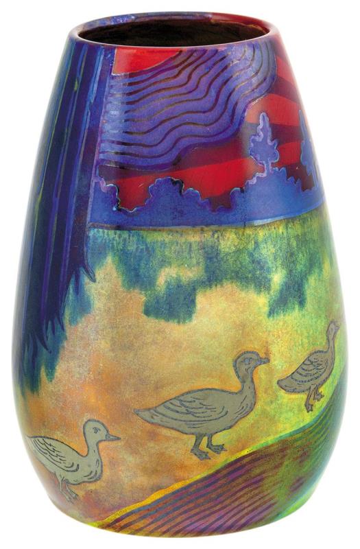 Nabis-váza, lemenő nap, tájkép és libák körképével,Zsolnay, 1899