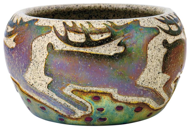 Szarvasos virágtartó edény a grés-sorozatból, Zsolnay, 1903