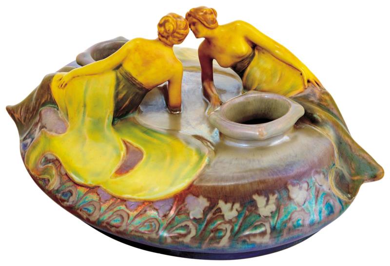 Váza, liliomok közt ülő nőalakok plasztikájával díszítve, Zsolnay, 1905